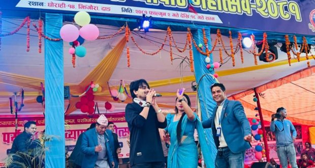 दाङ जिल्ला उद्याेग वाणिज्य संघकाे आयाेजनामा हिजाेदेखी घाेराहीमा सुरू भएकाे “छैठाै कृषि, पर्यटन तथा व्यापार महाेत्सव २०८१” मा तेस्राे दिन चर्चीत गायक प्रकाश दुतराजसँगै दर्शकहरू झुमेका छन् । महाेत्सवमा आईतवार राष्ट्रिय तथा स्थानीय कलाकारहरूकाे प्रस्तुति राखेका थिए ।
